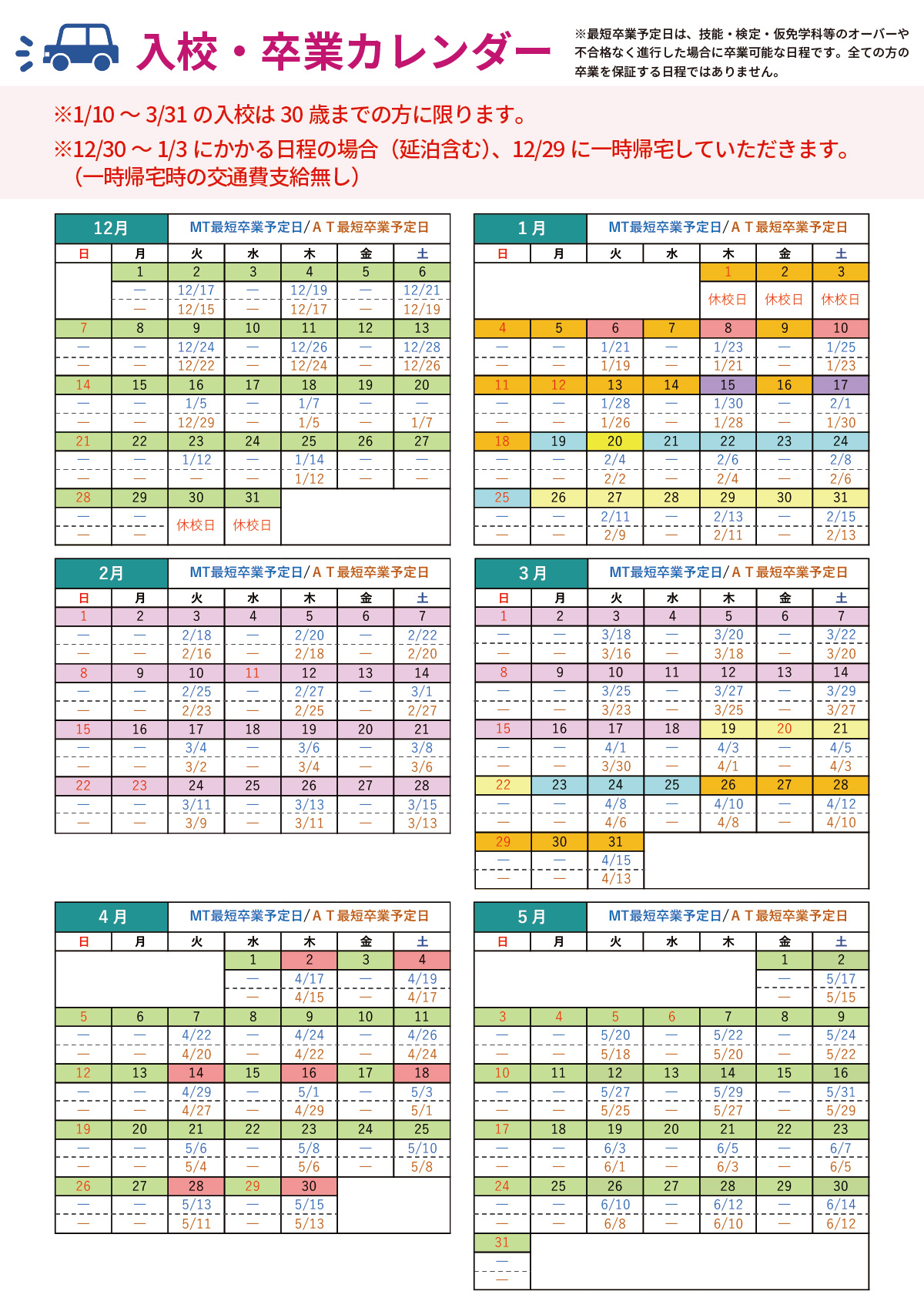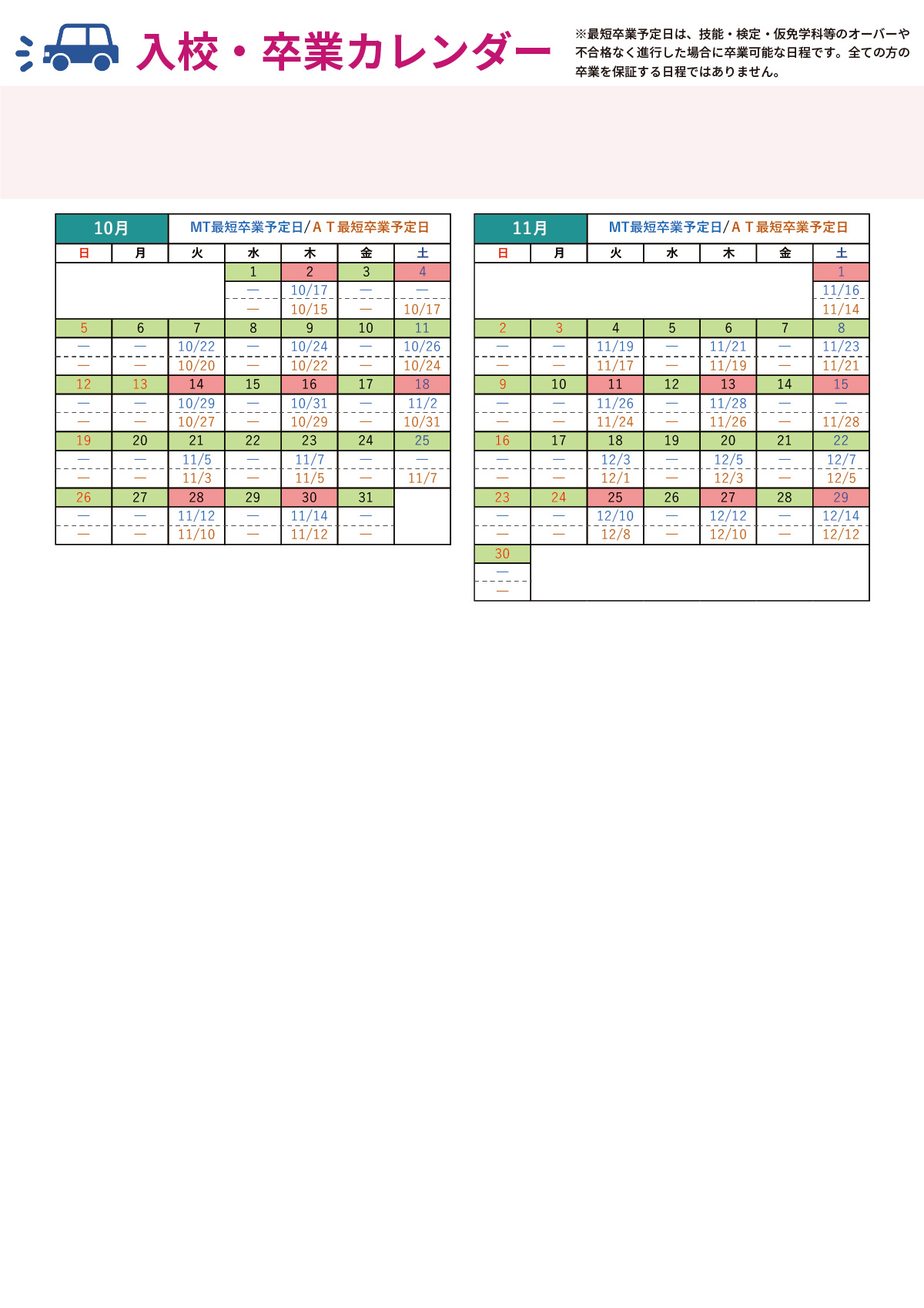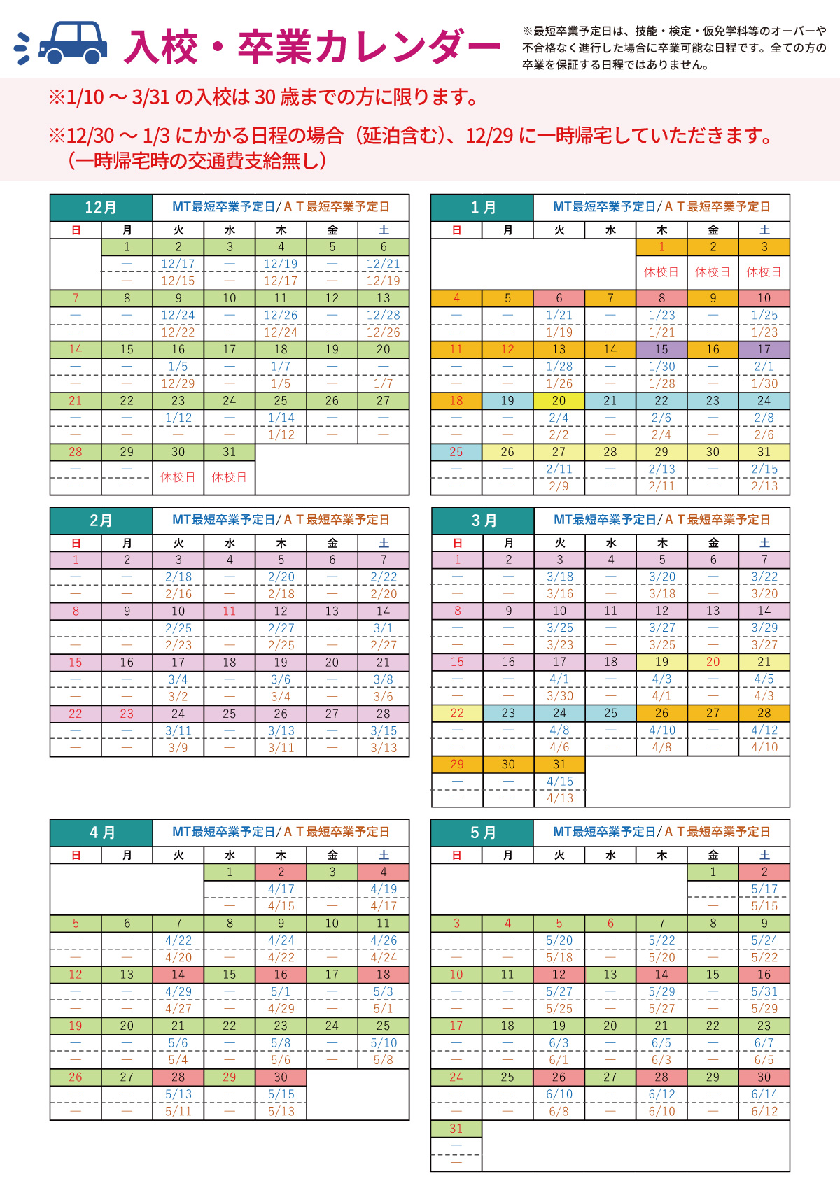 取得したい車種によって入校日と最短卒業予定日が決められています。